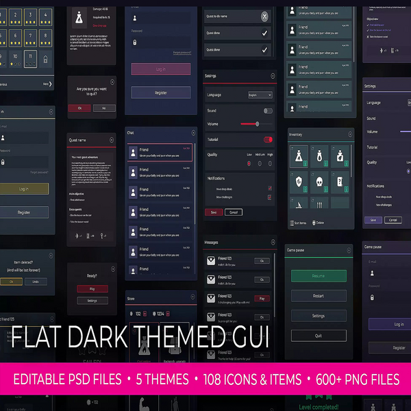Flat Dark Themed GUI / UI Kit - over 600 PNG !
